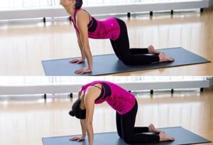- Con la exhalación, la cabeza baja, el abdomen se retrae y la columna se arquea (imitando a los gatos cuando se estiran).