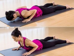 - Pon las manos al lado del pecho en el Inhala y mantén las manos ligeramente en el suelo.