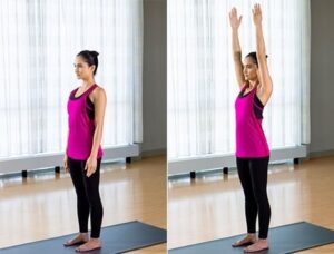 - Mira hacia adelante y levanta los brazos al lado de la cabeza con las palmas hacia